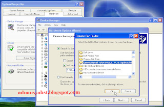 7. cari lokasi driver backup anda sesuai dengan komponen driver yang akan anda install. misalnya driver network driver, pilih di driver backup anda yang untuk network driver. lakukan semua proses untuk peripheral yang anda miliki yang bertanda tanya.