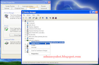 5. untuk merestore driver peripheral komputer anda dari backup driver yang anda miliki, dapat dilakukan pada icon "My Computer" yang ada di desktop --> Hardware --> Device Manager. pada daftar device manager anda yang ada tanda tanya, klik kanan kemudian pilih update driver.