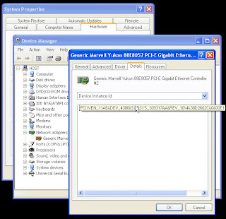 2. Pilih Tab "Details", dibawah combo Device Instance ID klik kotak dibawahnya kemudian copy Instance ID nya dengan menekan tombol Ctrl+C. contoh Instance ID : PCI\VEN_11AB&DEV_4380&SUBSYS_309317AA&REV_10\4&38D2602C&0&00E1